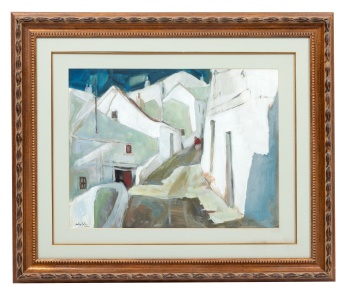 (Bilbao 1931 - 2003) "Casas blancas y personaje" Firmado: Campos Goitia Óleo / Papel 50 x 65 cm. ; 84 x 100 cm. (con marco)
