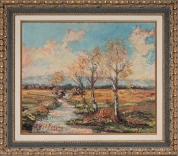(S. XX) "Paisaje con río y árboles" Firmado: R. del Fresno Óleo / Táblex 45 x 54 cm.; 62,5 x 72 cm. (con marco)