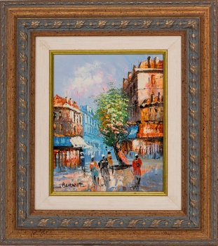 (Estados Unidos 1877- Francia 1950) "Personajes en París" Firmado: Burnet Óleo / Lienzo 25 x 20 cm.; 43 x 38 cm. (con marco)