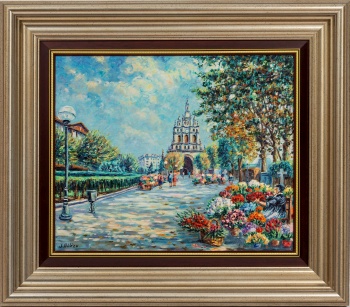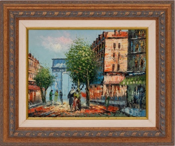 (Estados Unidos 1877- Francia 1950) "Vista del arco del triunfo con personajes. París " Firmado: Burnet Óleo / Lienzo 31 x 40 cm. ; 48 x 58 cm. (con marco)
