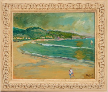 (S. XX) "Paisaje con personajes en la playa " Firmado: Tellería Óleo / Lienzo 38 x 46 cm. ; 51,5 x 59,5 cm. (con marco)