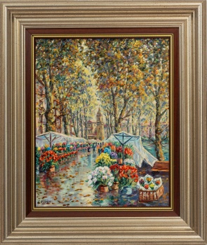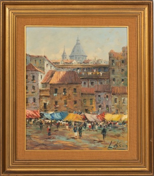 (S. XX) "Mercado de las flores, El Arenal, Bilbao" Firmado: J. Albizu Óleo / Lienzo 55 x 46 cm.; 80 x 70 cm. (con marco)