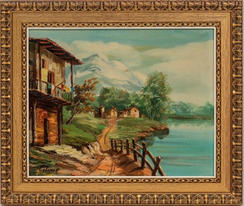 (S. XX) "Casas a orillas del lago" Firmado: Colome Óleo / Táblex 33 x 40 cm.; 43,5 x 51,5 cm. (con marco)