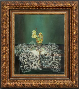 (S. XX) "Bodegón de copa, uvas y tapete" Firmado: Lucas Prada Óleo / Lienzo 55 x 46 cm.; 69 x 80 cm. (con marco)