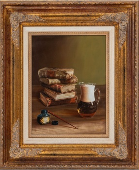 (S. XX) "Bodegón de jarra, libros y tinta" Firmado: G. Prieto Óleo / Lienzo 41 x 33 cm.; 69 x 60 cm. (con marco)