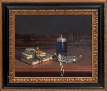 (S. XX) "Bodegón de libros, bronce y rosario" Firmado: Marcos Óleo / Lienzo 54 x 65 cm.; 77 x 87,5 cm. (con marco)