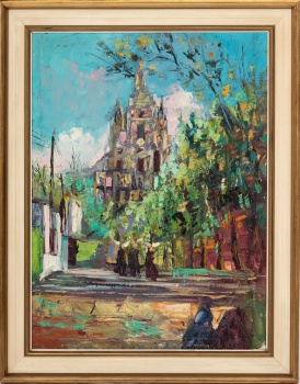 (S. XX) "Vista de la Basílica de Begoña con personajes" Óleo / Lienzo 73 x 54 cm.; 86 x 67 cm. (con marco) Pequeño deterioro