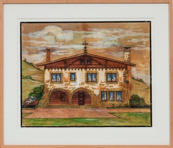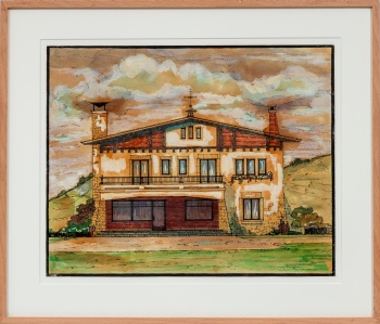 (Pp. S. XX) "Paisaje con caserío" Mixta / Papel 32,5 x 41 cm.; 46 x 54 cm. (con marco)