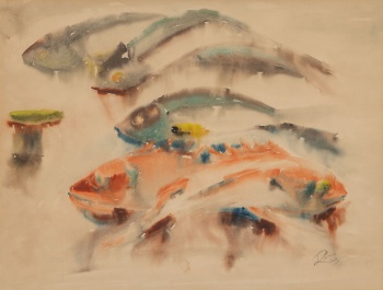 (Ateca, Zaragoza 1897 - 1969) "Bodegón de peces" Firmado: Rogelio Blasco 60 Acuarela / Papel 48 x 64 cm.; 69 x 85 cm. (con marco)