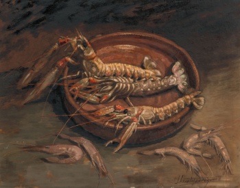 (Pp. S. XX) "Bodegón de cigalas y gambas" Firmado: J. Arroitajauregui Óleo / Tabla 33 x 42 cm.; 50 x 59 cm. (con marco)
