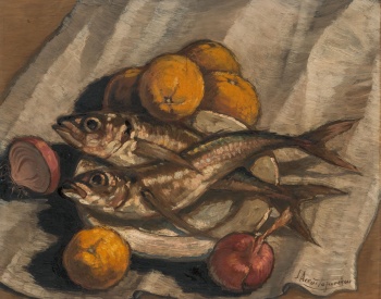 (Pp. S. XX) "Bodegón de peces, cebollas y limones" Firmado: J. Arroitajauregui Óleo / Tabla 33 x 42 cm.; 50 x 59 cm. (con marco)
