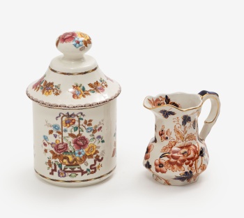 Lote compuesto por tarro y jarra en porcelana policromada y dorada con decoración de flores, hojas, dragones y lazos. Sello en la base. España e Inglaterra.