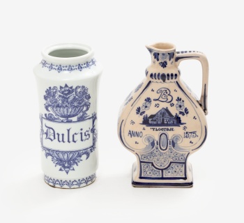 Lote compuesto por botella y albarelo de farmacia en porcelana blanca y azul con decoración de flores. Sello en base. España y Amsterdam