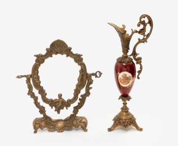 Lote compuesto por ánfora en bronce y porcelana policromada y dorada con decoración de escena bucólica, hojas, perlas y gallones. Manufactura Limoges. Espejo de sobremesa en bronce con decoración de niños y rocallas. Estilo Luis XV.
