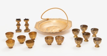 Lote compuesto por centro, 2 candeleros y 13 cuencos para huevos en metal con decoración de hojas, gallones, perlas, etc.