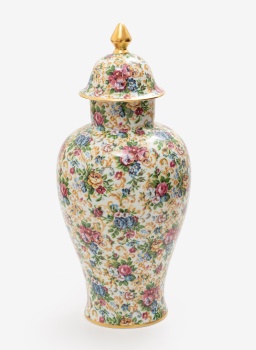 Jarrón con tapa en porcelana policromada y dorada con decoración de flores. Sello en la base. Luiten. Kachemir.