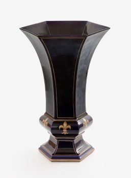 Jarrón en porcelana azul y dorada con decoración de flores de lis. Estilo Regencia,