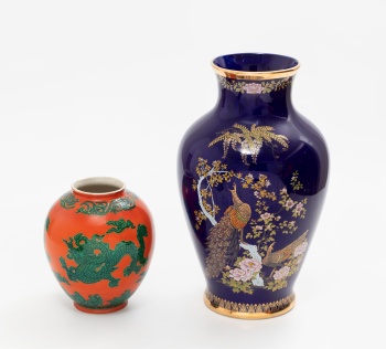 Lote compuesto por jarrón en porcelana policromada y dorada con decoración de ave del paraíso, flores y hojas y jarrón oriental en porcelana policromada con decoración vegetal y dragones. Sello en la base.