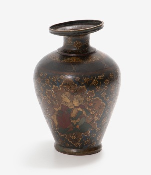 Jarrón oriental en metal con 3 medallones representando escenas con personajes, caballo y decoración de flores y hojas. Persia.