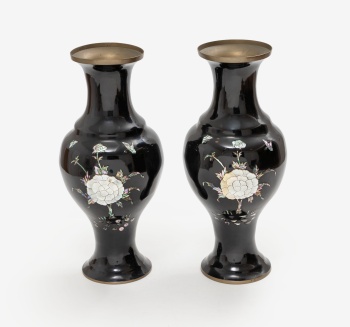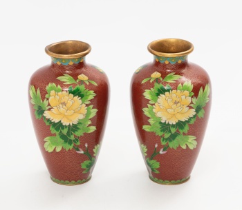 Pareja de jarrones orientales en esmalte cloisonné con decoración de flores y mariposas.