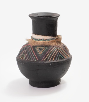 Jarrón africano en cerámica policromada con decoración geométrica realizada con cuerda de diferentes colores. Firmado Daniela 92.