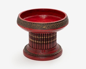Centro oriental en madera lacada en rojo y dorado con decoración de flores, columnas y perlas.