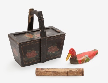 Lote compuesto por caja, quemador de incienso y figura en madera pintada representando pato con decoración de flores y hojas.