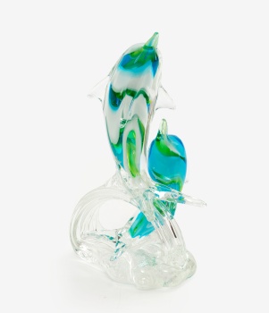 Figura en cristal de Murano en tonos azul y verde representando delfines.