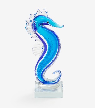 Figura en cristal de Murano en tonos azules representando caballito de mar.