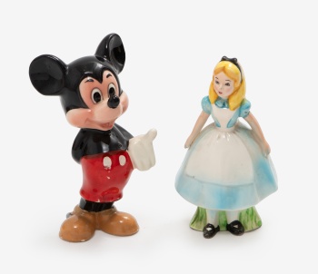 Lote compuesto por 2 figuras en porcelana policromada representando personajes de Disney: Mickey y Alicia en el País de la Maravillas. Sello en la base.