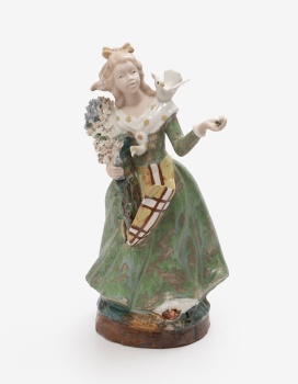 Figura en porcelana policromada representando joven con paloma y flores. Sello en la base. Manufactura Inglés. Valencia.
