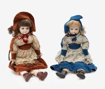 Lote compuesto por 2 muñecas con cara, manos y pies en porcelana. Vestidos antiguos en tela, raso y puntillas.