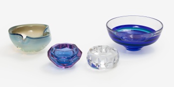Lote compuesto por 3 centros en cristal en tonos azul, lila y verde. Firmado y cenicero en cristal tallado Firmado Sévres. Francia.