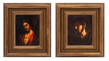 (S. XX) "Dama" y "Personaje (pareja)" Óleo / Lienzo 24 x 19 cm. (cada uno); 41,5 x 36,5 cm. (cada uno con marco)
