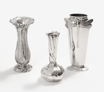 Juego compuesto por 3 jarrones en bronce plateado con decoración de flores, hojas y libélula. Con marcas del platero Cristofle. Estilo Modernista.