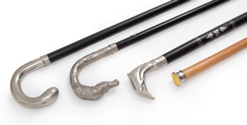 Lote compuesto por 4 bastones en madera y pomos en plata, esmalte y metal plateado representando caballo y ave.