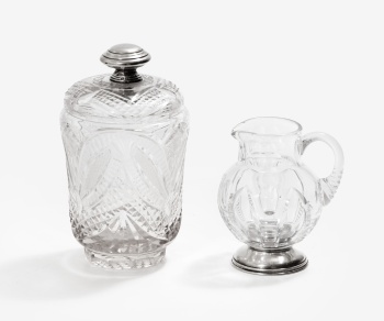 Conjunto de jarra y bombonera en cristal tallado y grabado con decoración vegetal. Base y tapón en plata. Estilo Luis XVI. Marcas de platero.