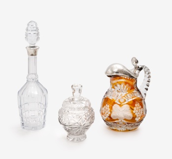 Lote compuesto por jarra en cristal tallado y grabado con decoración de hojas de parra y racimos de uvas, con tapa en plata. Bombonera en cristal tallado y licorera en cristal con gollete de plata. Estilo Luis XVI. Marcas de platero.