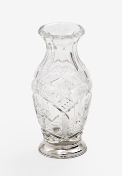 Jarrón en cristal tallado y grabado con decoración vegetal y base en plata. Estilo Luis XVI. Marcas de platero.