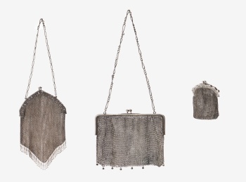 Lote compuesto por 2 bolsos de mano y 1 monedero en plata y metal con decoración de flores y hojas.