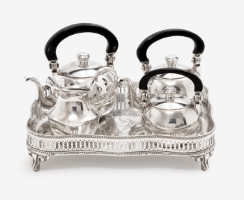 Juego de café y bandeja en alpaca con decoración de flores y hojas compuesto por 5 piezas: tetera, cafetera, lechera y azucarero. Estilo Luis XVI.