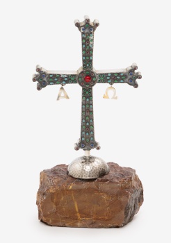Figura en metal plateado representando Cruz de la Victoria con incrustaciones de piedras cabujones. Base en piedra.