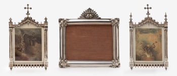 Conjunto de 3 sacras en metal plateado con decoración de ángeles, rocallas, columnas a los lados y cruces. Estilo Luis XVI.