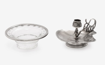 Lote compuesto por palmatoria en metal plateado con decoración de flores. Marca de platero. Meneses. Estilo Modernista. Centro en cristal tallado con decoración vegetal y cerco en metal . Estilo Luis XVI.