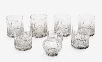 Conjunto compuesto por jarra de agua y 6 vasos de whisky en cristal tallado y base en plata con decoración vegetal. Marcas de platero.