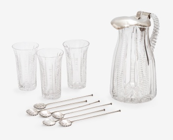 Juego de jarra y 3 vasos en cristal tallado y plata con decoración vegetal y 6 agitadores en plata representando hoja. Marcas de platero.