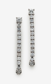 Descarga el catálogoPendientes largos en oro blanco con fila de diamantes talla brillante con un peso total de 1,30 cts. Peso: 3,9 grs.