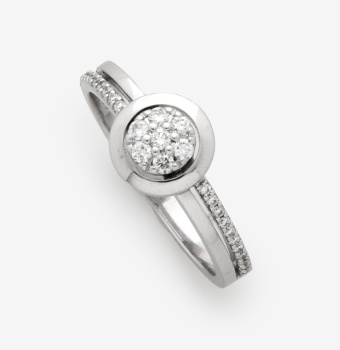 Sortija en oro blanco con cuajado central de 7 diamantes talla brillante y diamantes talla brillante en el brazo con un peso total de 0,30 cts. aprox. Nº Anillero: 13,5. Peso: 3,7 grs.