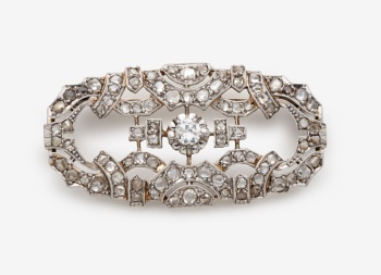 Broche antiguo en oro blanco con diamante talla brillante central con un peso de 0,12 cts. aprox. y diamantes rosas alrededor con decoración vegetal. Peso: 6,2 grs.