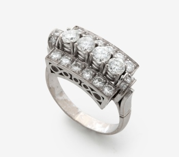 Sortija Art Decó en oro blanco con 4 diamantes talla brillante centrales y 2 filas con un peso total de 1,40 cts. aprox., . Montura calada con decoración geométrica. Nº Anillero: 17,5. Peso: 7,2 grs.